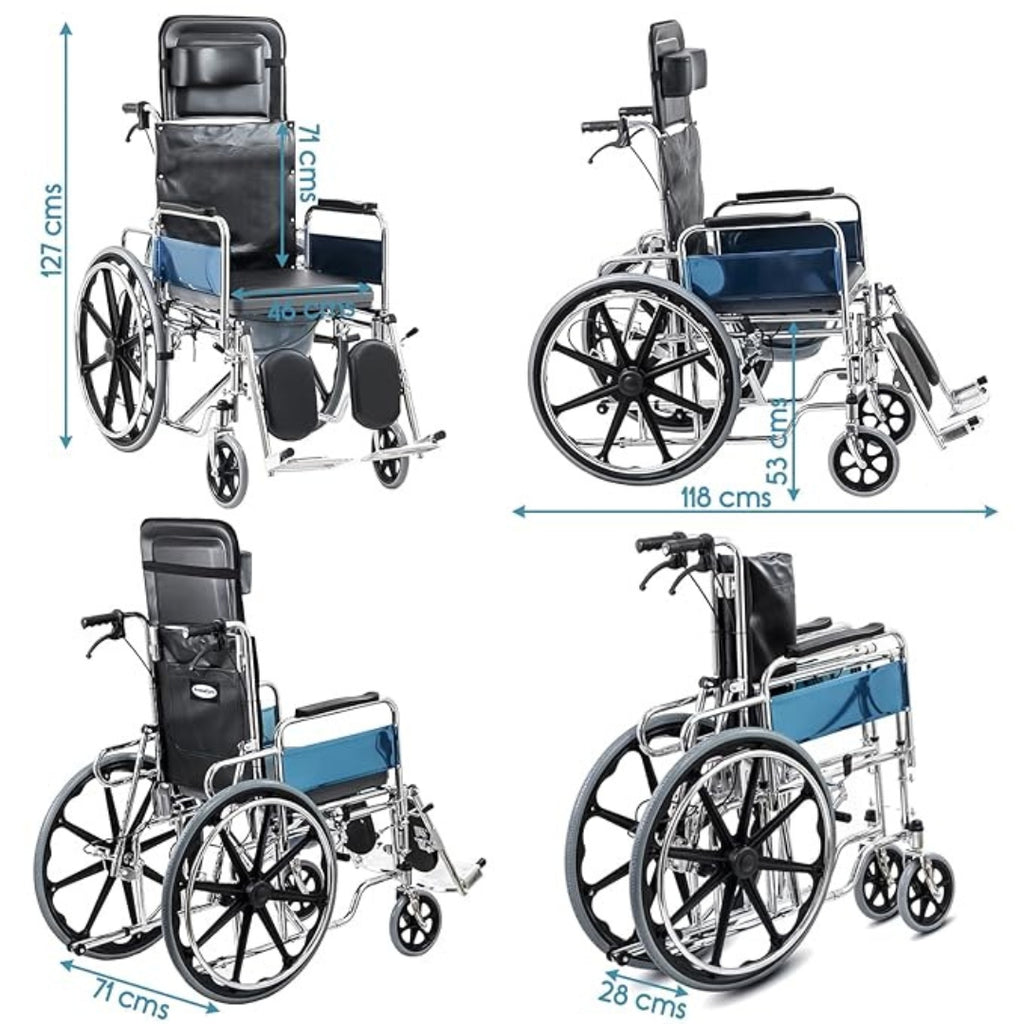 4. It has heavy-duty rear wheels along with castors and comes with anti-tippers. The back of the wheelchair can be tilted for utmost patient comfort and comes with a detachable headrest for extra support.
