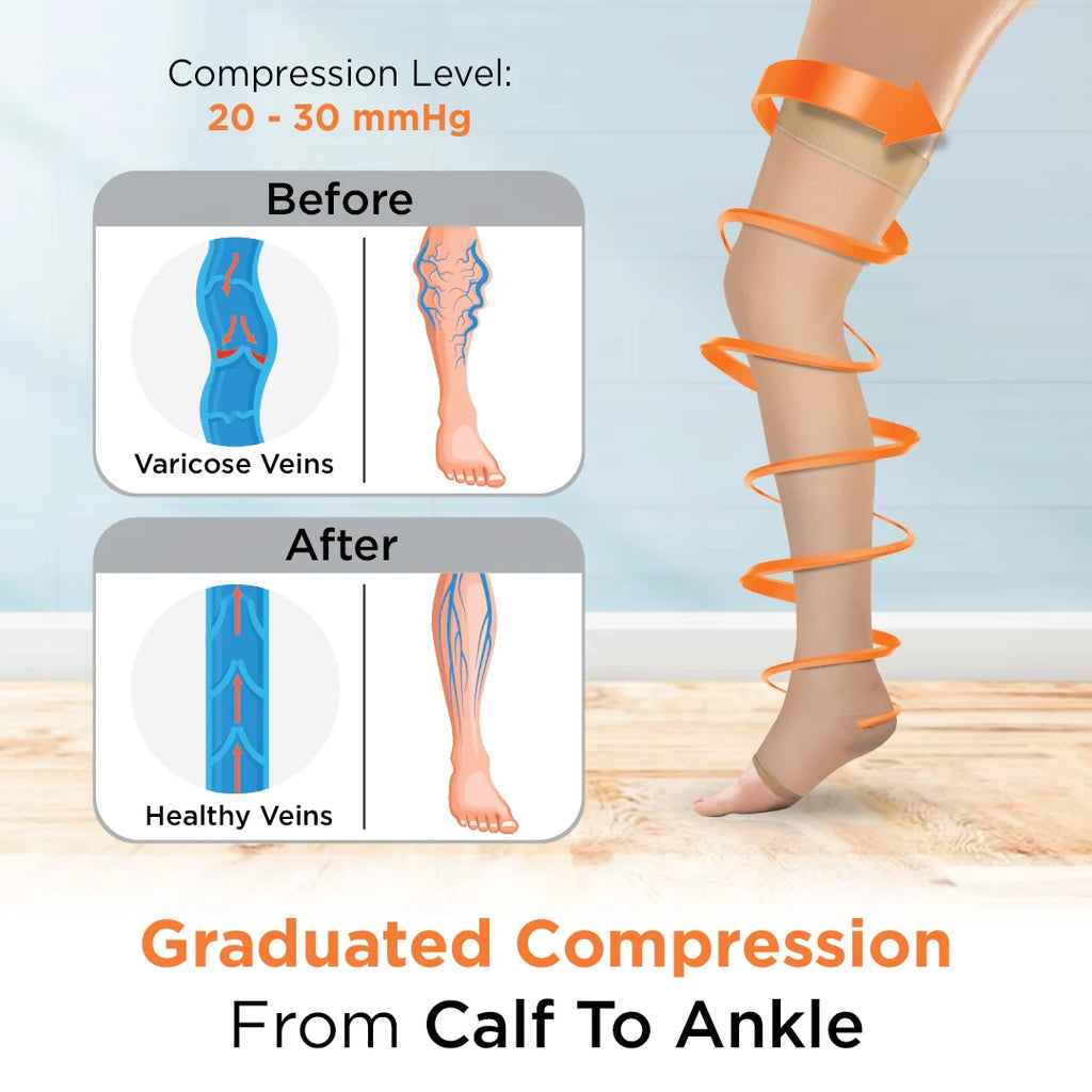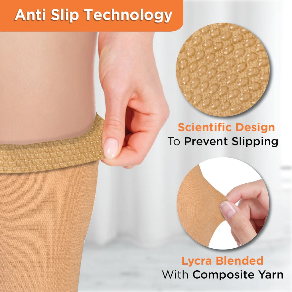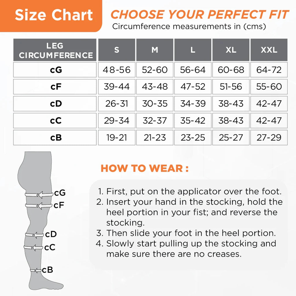 These medical compression stockings provide graduated compression from the ankle to the thigh. It helps to improve blood flow and prevent varicose veins. It is lightweight and comfortable to wear. It provides graduated compression with maximum compression at the ankle, decreasing towards the thigh. It helps to maintain blood flow and reduce discomfort and swelling. It helps in the prevention of Varicose Veins in advanced stages. The compression provided is 23-32 mm Hg, ideal as per international standards for varicose veins prevention. Silicone top band which prevents the stocking from sliding down. The skin-friendly material helps to maintain breathability while providing therapeutic effects.